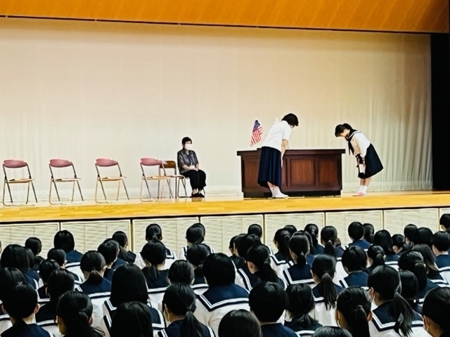 6限は、災害救助犬について学びました。能登半島地震にボランティアで参加したときの状況を聞き、そのあとは救助犬2頭による実演を見ました。登場した救助犬に思わず「かわいい~」という声が漏れ、命令に従う賢さに感嘆。最後に、代表の生徒が隠れて捜索される訓練を見ました。