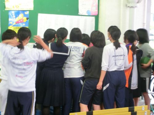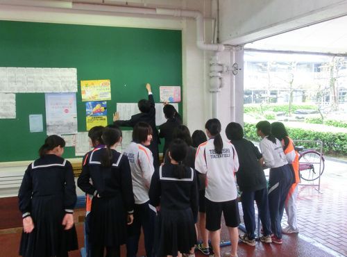 先生がピロティの掲示板にホーム編成の紙を貼り出すと、部活で来校していた生徒が続々と集まってきました。