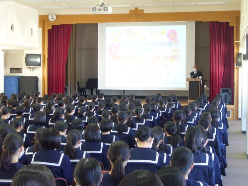 本日5限目に、高校2年生の皆さんを対象に人権学習がありました。 「だれもが幸せにくらすために~女性の人権~」と題して高知県人権啓発センター研修講師の先生からご講演をいただきました。