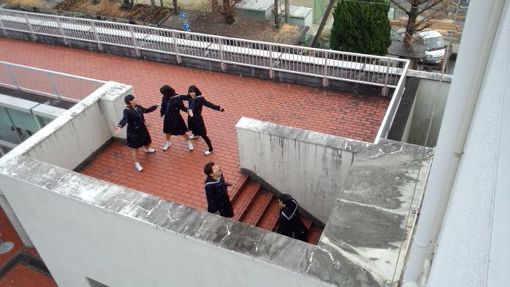 まるで芸能人が中庭に来たかのように、中学生が寒さに負けずベランダで青春を謳歌しています。