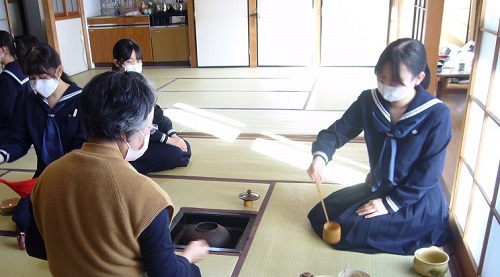 本校にはお茶室があります。本校では学校外から土佐石州流の先生方においでいただいて指導をお願いしています。